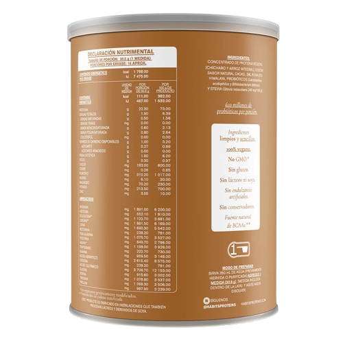 Sustancia Activa: Concentrado de Proteína Vegetal (Chícharo y Arroz Integral), Cocoa, Aminoácidos de Cadena Ramificada, Sabores Naturales, Sal Rosa del Himalaya, Probióticos y Extracto de Hoja de Stevia.